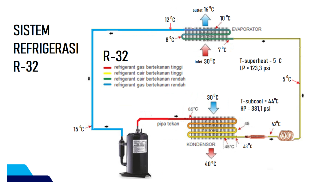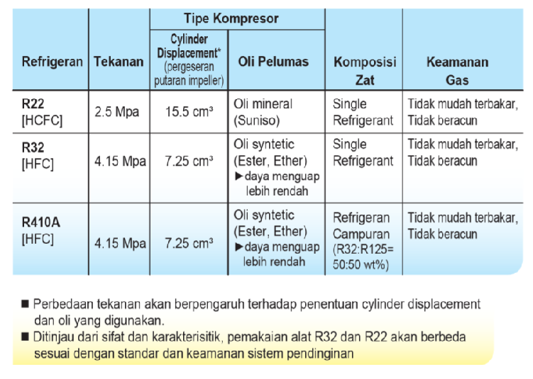Refrigeran merupakan zat/bahan yang diisikan ke dalam sistem instalasi AC yang berfungsi untuk menyerap kalor dalam ruangan. Penyerapan kalor dalam ruangan dapat dihitung berdasarkan kapasitas AC yang dinyatakan dalam nilai BTU/h atau kcal/h. Ada beberapa jenis refrigeran yang digunakan oleh AC komersil yakni R-22, R-32 dan R-410a.