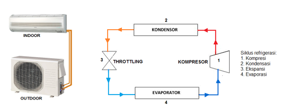 Air conditioner (AC) merupakan perangkat elektronik yang mampu mengkondisikan udara (tata udara) sebagai penyejuk udara dalam ruangan. AC terdiri atas dua bagian yakni unit indoor dan unit outdoor. Unit indoor berfungsi menyerap udara panas dari dalam ruangan dan mengeluarkan udara udara sejuk (menyerap kalor) untuk selanjutnya dihembuskan oleh fan indoor. Sedangkan bagian outdoor berfungsi melepas kalor akibat perubahan wujud refrigerant dari fase gas menjadi liquid (kondensasi). Cara kerja AC rumah dapat dilihat pada gambar dibawah ini.
