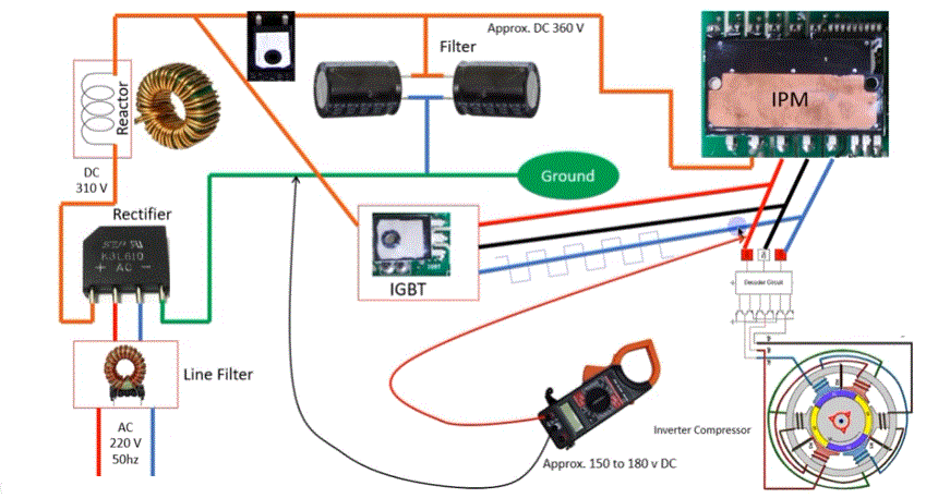 Pada gambar di atas tampak bahwa AC inverter menggunakan arus DC untuk mengatur kerja kompresor. Arus DC tersebut telah dimodulasikan oleh komponen yang disebut IPM (intelligent Power Modulation) atau PWM (power with modulation) sehingga menghasilkan tegangan 310V-330V DC yang memiliki frekuensi kerja antara 40hz – 150hz. Semua kinerja kompresor AC inverter dikendalikan oleh komponen IPM tampak seperti pada gambar dibawah ini :