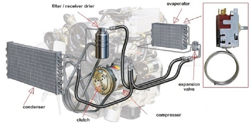 Secara umum komponen AC alat berat dibagi menjadi tiga kelompok, yakni komponen refrigerasi, kelistrikan & sistem kontrol elektronik. Komponen refrigerasi AC yang terdiri atas kompresor open type (v-belt) & magnetic clutch, kondensor, receiver, moisture indicator, ekspansion valve dan evaporator. Komponen kelistrikan dan sistem kontrol terdiri atas thermostatic switch, control tekanan refrigeran, sensor suhu, sensor sensor pendukung lainnya dan electronic control modul. Komponen refrigerasi AC alat berat tersusun seperti pada gambar di bawah :